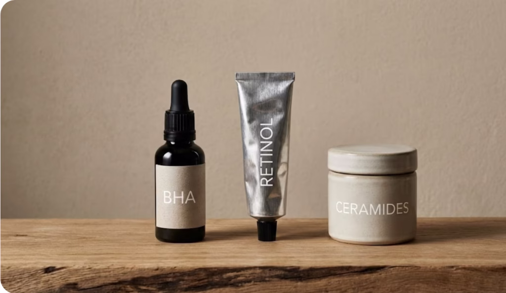 - BHA (Salicilo rūgštis) – karalienė: Tai vienintelė rūgštis, tirpstanti riebaluose. Ji prasiskverbia pro sebumo kamštį giliai į porą ir išvalo ją iš vidaus. Ji taip pat mažina raudonį.