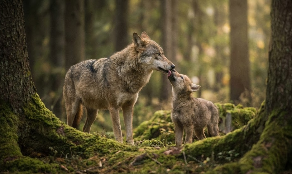 Garsus vilkų tyrinėtojas ir biologas L. Davidas Mechas, praleidęs dešimtmečius stebėdamas vilkų elgseną natūralioje aplinkoje, aprašo reiškinį, kurį mokslininkai vadina „trofiniu laižymu“. Vilkų jaunikliai laižo motinos snukį, kad paskatintų ją atryti apvirškintą maistą. Skamba ne itin estetiškai, tiesa? Tačiau gamtoje estetika nėra prioritetas – svarbiausia yra išlikimas.