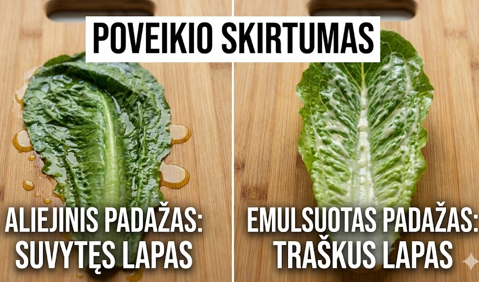 Kai tokį emulsuotą padažą pilate ant salotų, lapai pirmiausia liečiasi su išoriniu lašelių sluoksniu – rūgštimi (vandeniu), kuri nepažeidžia vaškinio lapo sluoksnio. Aliejus lieka saugiai „supakuotas“ viduje, suteikdamas skonį, bet nekenkdamas tekstūrai.