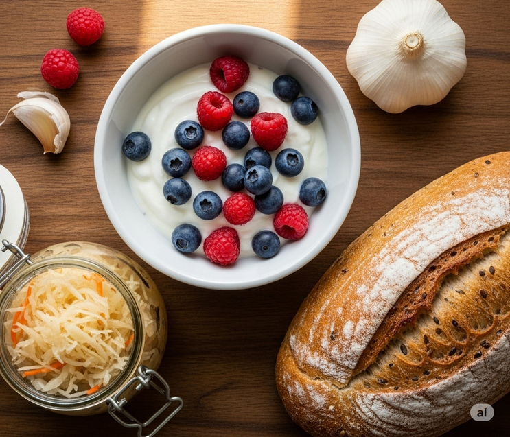 - Fermentuotas maistas (probiotikai): Įtraukite į racioną raugintų kopūstų, natūralaus jogurto, kefyro. Šie produktai papildo žarnyną gerosiomis bakterijomis.