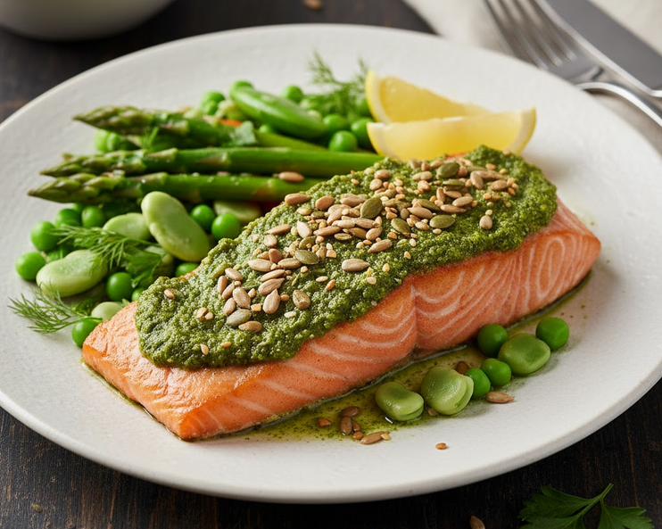 Tai – tobulas „smegenų maisto“ pavyzdys. Lašišos filė, aprūpinanti mus gyvybiškai svarbiomis omega-3 rūgštimis, užkepama su pesto padažu ir skrudintomis sėklomis – dar vienu sveikųjų riebalų šaltiniu. Patiekiama su garintomis pavasario daržovėmis – šparagais, morkytėmis ir žirneliais – kurios išsaugo maksimalų vitaminų kiekį. Tai lengva, bet soti vakarienė, po kurios jausitės ne apsunkusios, o pamaitinusios savo smegenis.